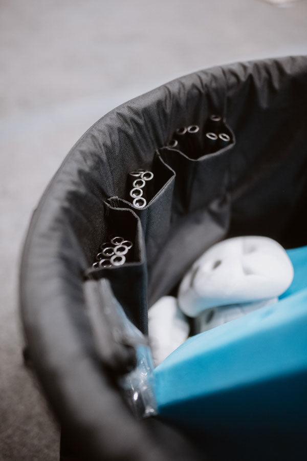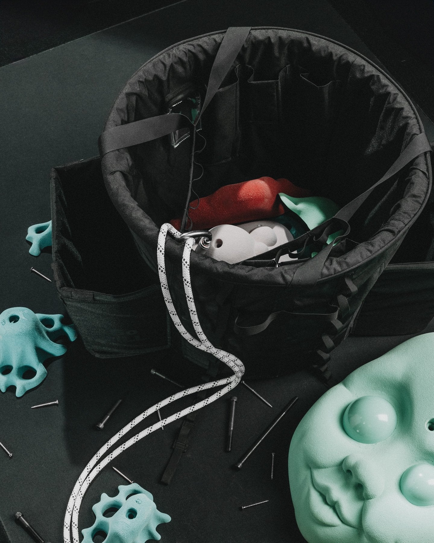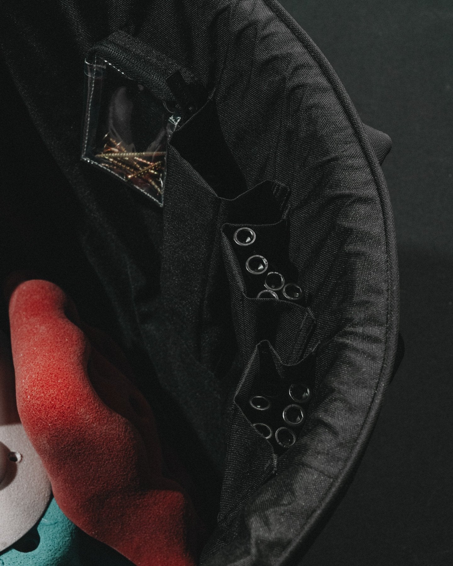 Just got this big bag and set with a mix of large and small holds. Loved the two side pockets and took advantage of many of the clipping points. Bought he recommended 17 gallon bucket from Walmart ($15) and it was a snap to put the bag together. The pockets for the longer bolts came in handy, one of which was perfect for my phone. The see through pockets seem least useful. Because of their design they require more precision picking to get into and because of their depth I wouldn't want ot store smaller bits in them. Would have fine with just another shallow pocket (or 2) like the bolt pockets. Lastly, for such a beefy bag, the two straps that it hangs from are surprisingly thin. Would have expected wider straps or reinforced loops. All in all, a big upgrade from the rigid, porous bin from ULINE that I have been using.